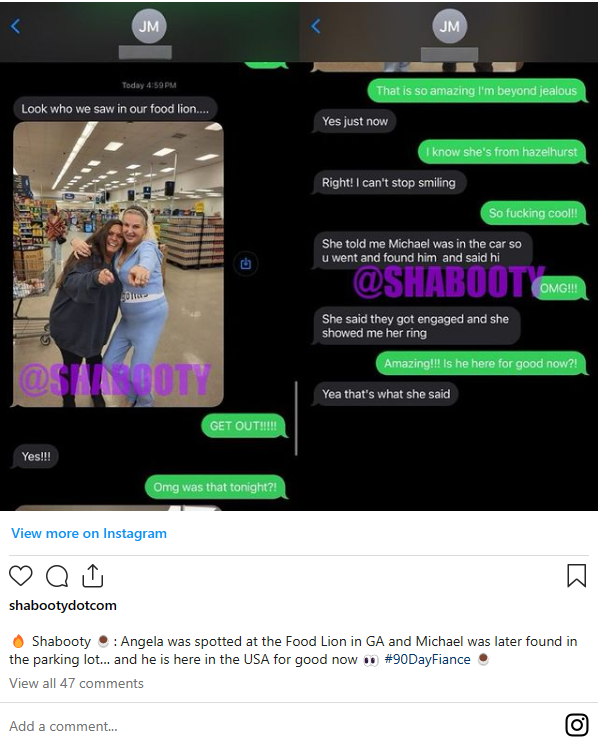 It sounds like Michael and Angela may be going the distance! In another post from SHABOOTY, a fan writes that Angela was seen at a Food Lion near her home town and that Angela told her Michael was in the parking lot and they’ve officially gotten engaged!