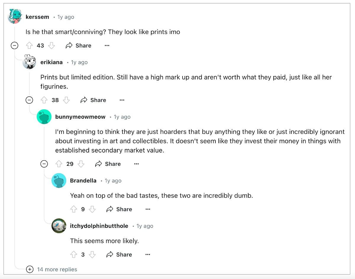Another enterprising Redditor posted in August 2024 about the artwork as well, going into full detective mode by identifying a slew of the pieces in five separate Reddit posts. “Here is a list of paintings that I have compiled after going through K&R’s real estate photos/3D Tour. This list is incomplete as I was unable to identify quite a few pieces …. Please note that I am not sure if some of these pieces are originals or prints so please take these prices with a grain of salt. I am also not accounting for sale prices.”