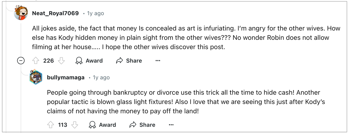 Another Reddit post from around that time is titled “Kody and Robyn are buying artwork to hide money from the other wives.” The Redditor speculated: “Why are they suddenly such patrons of the arts??? Perhaps because many divorce advice sites and forums recommend purchasing expensive items (like artwork) in cash and **forgetting** to ask for a receipt so you can underreport its worth or hide it, and then sell it eventually.”