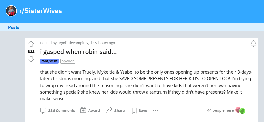 Sister Wives fans admit they raced to Reddit to explode about how angry what Robyn said made them. Fans agreed it felt like Robyn was refusing to let any of Kody’s other children feel special. Likewise, fans pointed out that the Christmas tree was loaded with stuff. And, the kids just didn’t need any more presents.