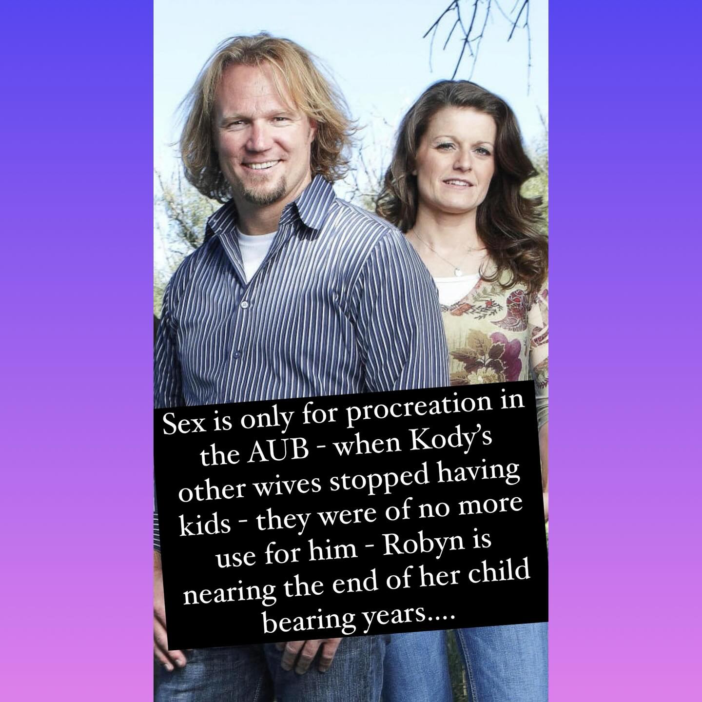 In fundamentalist polygamy, sex is only for procreation. This is why Robyn on the show was dangling more kids to Kody. Once she stops procreating, she is out to pasture with the rest.